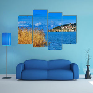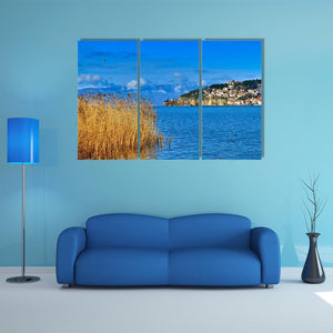 This stunning canvas features the serene waters of Lake Ohrid, framed by tall reeds and a charming town on a hillside. The bright blue and gold palette create a scenic atmosphere, perfect for bringing a touch of nature into your space.