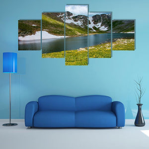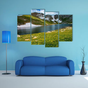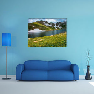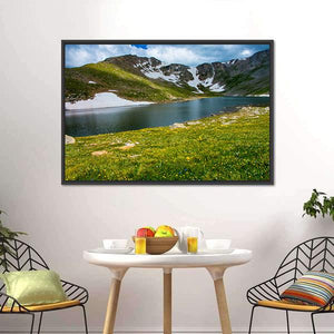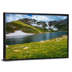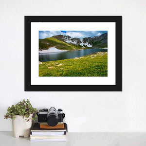 Lake With Mount Evans Canvas Wall Art presents a wide, natural view of a mountain lake beneath Mount Evans, with snowy peaks, a grassy meadow, and scattered yellow wildflowers. The calm lake surface reflects the blue sky, creating a serene, majestic mood that suits modern living rooms, entryways, or a home office.