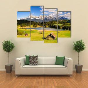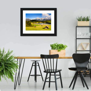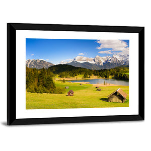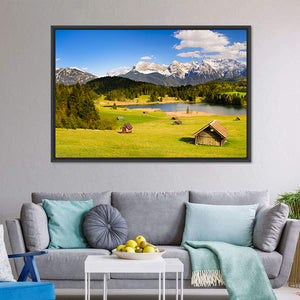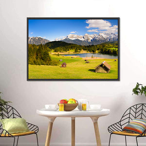 Lake & Alps Bavaria Canvas Wall Art shows a lakeside view with a snow-capped mountain range, alpine meadows and scattered wooden huts. The realistic, rustic landscape reads as serene and majestic, a calm focal point for nature-inspired or rustic rooms.
