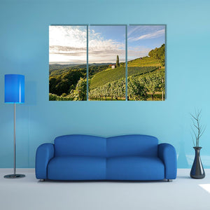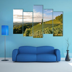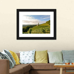 Grapes In Vineyard Canvas Wall Art captures rows of grapevines on rolling hills beneath a sunny sky with wispy clouds. The realistic, nature-photography style creates a serene, idyllic mood that feels peaceful and inviting. Suited to modern living spaces, it adds a calm, natural focal point to a wall.