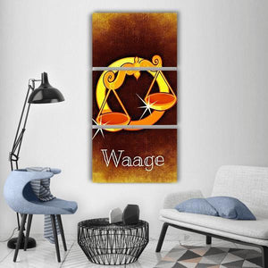 This canvas print features the Libra zodiac symbol with the word Waage printed below, set against a textured gradient in gold, orange, and brown. Its graphic, vertically symmetrical composition reads celestial and bold, a symbolic piece that fits modern living rooms or contemporary home offices.