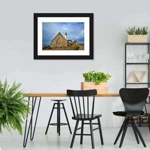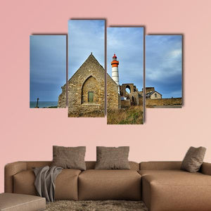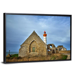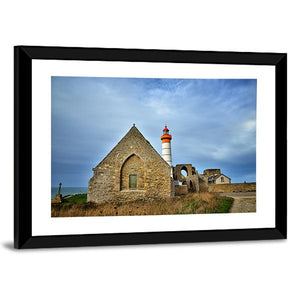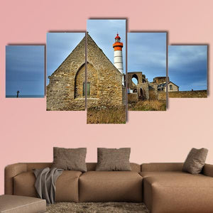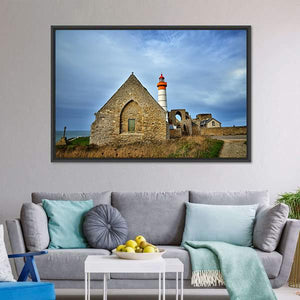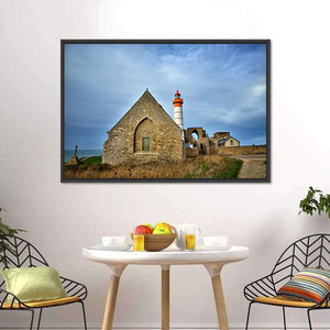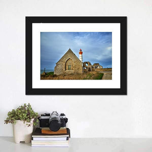 Lighthouse In Brittany shows a striped lighthouse with a red top beside stone ruins with arched windows along a grey coastline. The overcast sky, muted blues and browns, and dry grass in the foreground create a serene, desolate, historic mood that suits coastal, rustic, or vintage decor.