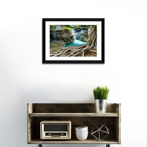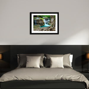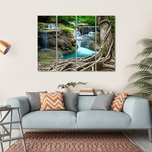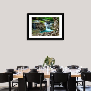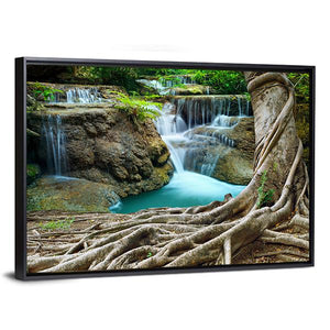 This stunning canvas art features a serene landscape with a multi-tiered waterfall, framed by lush green surroundings and exposed tree roots. The tranquil palette of turquoise water and earthy browns creates a natural ambiance, perfect for bringing the essence of nature into your space.