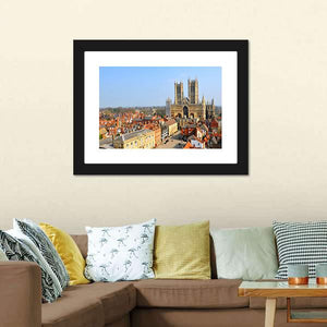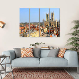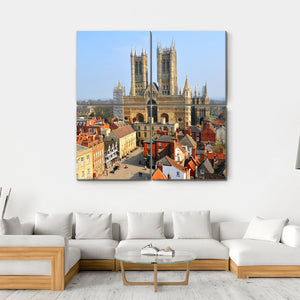 Capture the essence of Lincoln Cathedral with this bright and historic canvas wall art. Featuring a stunning aerial perspective, it showcases the iconic rooftops and scaffolding under a sunny sky, creating a vibrant atmosphere perfect for any space.