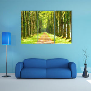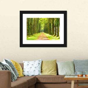 This realistic canvas depicts a linden tree–lined footpath through a spring forest, with sunlight filtering through the leaves and a gravel path underfoot. Its peaceful palette of green, brown, yellow and white creates a tranquil atmosphere, suited to modern or nature‑inspired rooms such as a living room or hallway. Converging lines of the path guide the eye into the scene and reinforce the calm, natural mood.