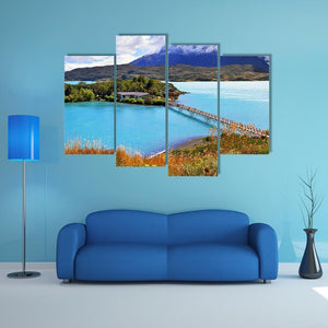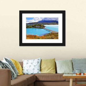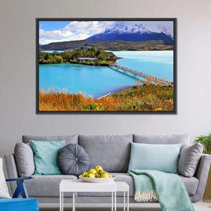 Little Island in Lake Pehoe captures a realistic lakeside landscape with a small island, buildings and a long wooden bridge. Snow-capped mountains rise beyond a grassy foreground, and a calm blue-green palette gives the scene a serene, tranquil feeling. Suited to modern or nature-inspired rooms, it makes a scenic, peaceful focal point for living spaces or bedrooms.