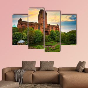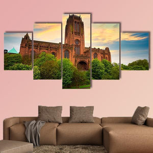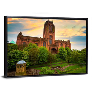 Liverpool Cathedral Of The Risen Christ captures a wide, eye-level view of a red brick cathedral framed by lush green trees beneath a dramatic sunset sky. Rendered in a photorealistic landscape palette of brown, green, orange, blue and yellow, it gives a majestic, serene, historical mood well suited to modern or historical interiors.