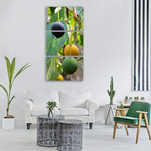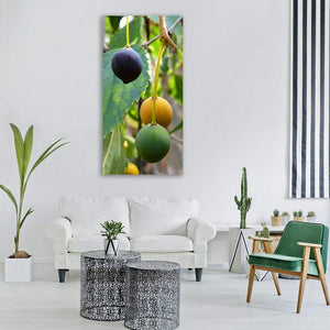 Three fruits — dark purple, yellow, and green — hang from thin stems on a branch in a close-up study with leaves. The natural, organic, simple mood and a palette of greens, purples, yellows, and browns make this canvas a calm choice for kitchen or casual room decor.