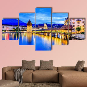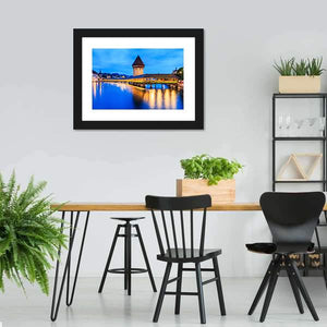 Chapel Bridge In Evening shows a covered bridge, riverside buildings and distant mountains at dusk. The realistic scene highlights lights reflecting on the water and a pointed roof tower, creating a serene, picturesque evening mood. Works well as subtle wall decor in modern interiors.
