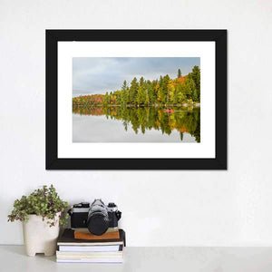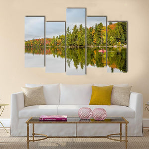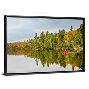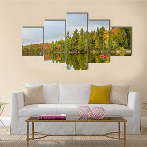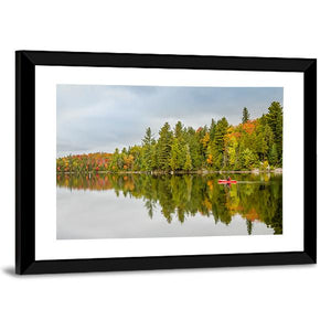 A lone kayaker paddles a red kayak across a quiet lake framed by autumn forest, with clear reflections in the water. The scene feels serene and tranquil, with green, orange and red tones that suit house and modern room decor.