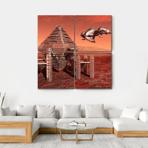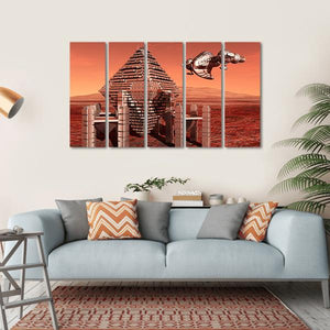 This captivating canvas art showcases a futuristic view of Mars, featuring a striking angular pyramid structure and a sleek spaceship against a surreal alien landscape. The vivid palette of red, orange, silver, and bronze creates a desolate yet awe-inspiring atmosphere, making it a perfect addition to modern wall decor.