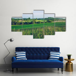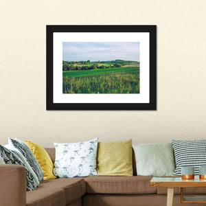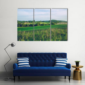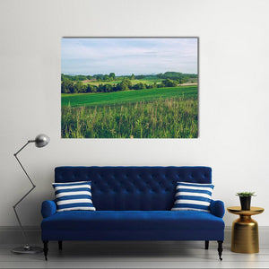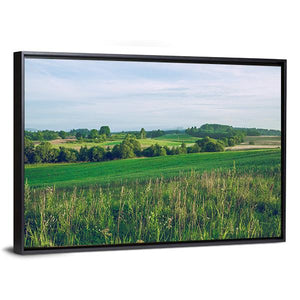 This canvas art captures a serene landscape of rolling hills, fields, and trees under a peaceful sky. The harmonious palette of green, blue, and brown creates a natural ambiance, making it suitable for various decor styles.