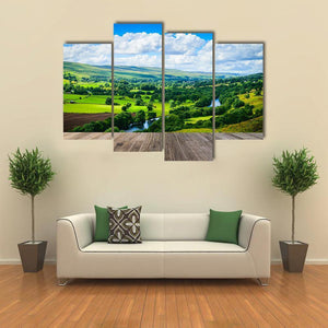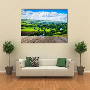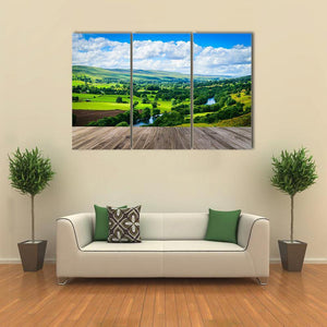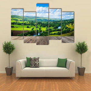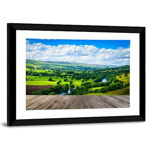 This canvas art features a serene river flowing through picturesque rolling green hills and wooded areas, capturing a realistic landscape. The soft palette of greens and blues evokes a calm, idyllic atmosphere that can enhance any room.