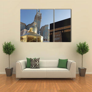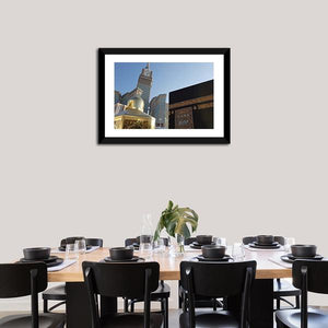This canvas art features the iconic Clock Tower in Mecca, depicting a majestic and spiritual scene. The photorealistic style captures its stunning architecture against a clear blue sky, making it a striking piece for your wall decor.
