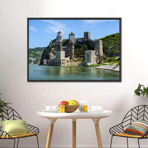 This canvas print presents the medieval Golubac Fortress on a rocky cliff above a river, with stone towers and fortifications beneath a clear sky. Rendered in a realistic style using green, blue, grey, and brown tones, the scene feels historical, majestic and serene. It works well as room decor for living rooms, studies, or modern homes seeking a calm architectural focal point.