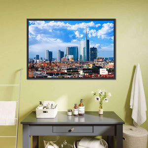 This canvas art captures the vibrant Milan skyline with stunning modern skyscrapers against a bright blue sky. The clear day atmosphere and layered depth invite a sense of urban energy, making it a striking piece for your wall decor.