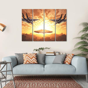 This canvas art captures a dramatic scene of two fighter jets chasing a UFO against a stunning orange and yellow sunset. Ideal for adding a touch of mystery and action to your space.