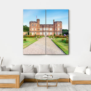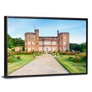 This majestic canvas wall art features a grand stone castle with turrets nestled among manicured gardens and a serene gravel pathway. The soft palette of brown, green, blue, and white brings a tranquil atmosphere to any space.