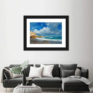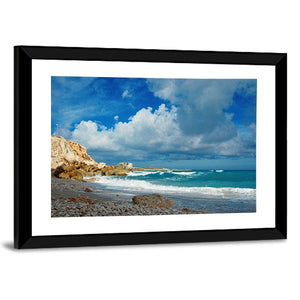 A realistic beach scene showing crashing waves against a pebble shore beneath dramatic clouds on a remote island. The blue, teal, white and gray palette feels both serene and dynamic, and it suits modern or coastal room decor.