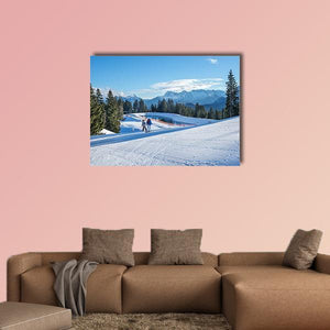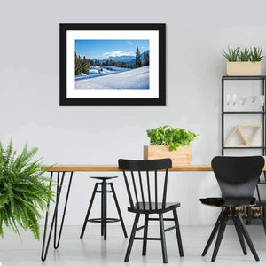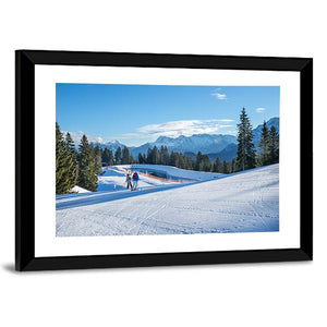 This realistic landscape print depicts skiers on a groomed ski slope framed by pine trees and a distant mountain range. The daytime, snow-bright scene reads peaceful and crisp, with blues, whites, greens and browns that calm the eye. It works well as room decor in modern homes seeking a quiet, natural accent.