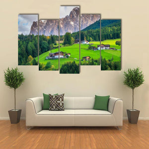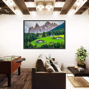 A realistic scene of an alpine village set beneath a mountain range, with forested hills, lush green meadows and snow-capped peaks. The view feels serene and picturesque — peaceful and idyllic, a quiet focal point that suits modern or rustic rooms.
