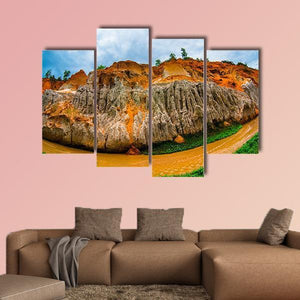 Fairy Stream — Vietnam presents a wide-angle, fisheye view of a canyon and river, shown in a realistic landscape. Warm oranges and browns sit with greens, blues, and white sky, emphasizing striated rock textures and muddy water for a dramatic, arid mood. Suited to modern living rooms or entryways that favor nature-inspired wall decor.