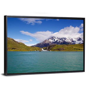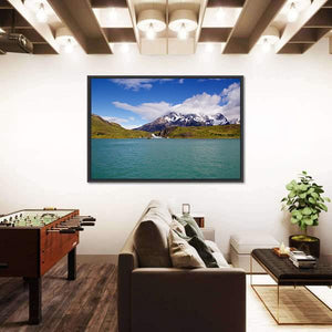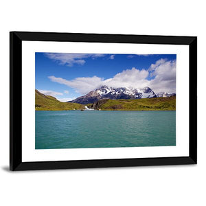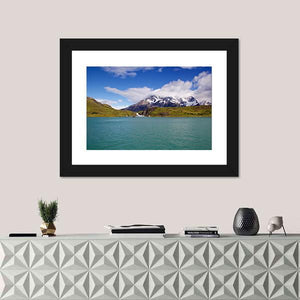 Mountains & Pehoe River presents snow-capped mountains, turquoise water, and a partly cloudy sky in a realistic landscape that feels serene and majestic. The tranquil scene makes a calm focal point for living rooms and modern interiors.