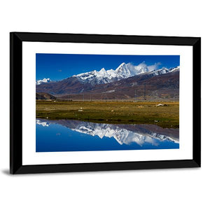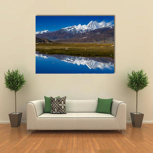 Snow-capped mountains and a clear lake reflection evoke a serene Tibet landscape. Cool blues, whites and greens give the scene a peaceful, majestic feel that works well in modern living rooms or bedrooms.
