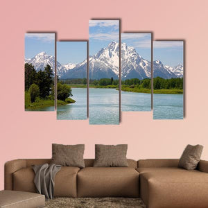 Mt Moran From Lake captures snow-capped peaks, a calm river and tree-lined shore in a realistic landscape. The blue, green, white and brown palette with a clear sky creates a serene, majestic daytime scene. This canvas print suits modern homes and nature-themed rooms.