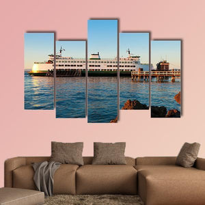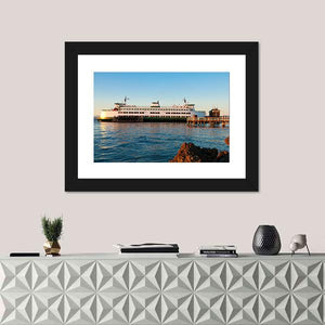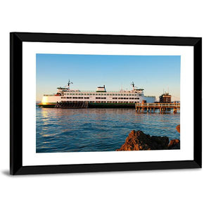 A realistic landscape showing a ferry crossing from Mukilteo to Bainbridge in Washington State, with calm water and a clear blue sky. A dock and a rock in the foreground balance the rule-of-thirds composition, and a blue, white, green and brown palette creates a serene, natural mood. Works well with modern or nature-inspired room decor.