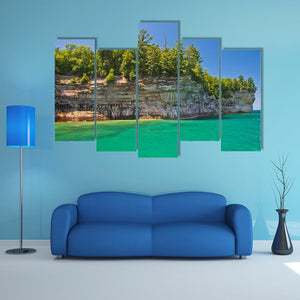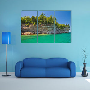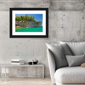 This canvas art beautifully captures the serene landscape of Pictured Rocks National Lakeshore, featuring coastal cliffs, clear turquoise waters, and dense green foliage. Its bright and natural vibe makes it a perfect addition to any nature-inspired decor.