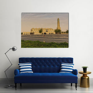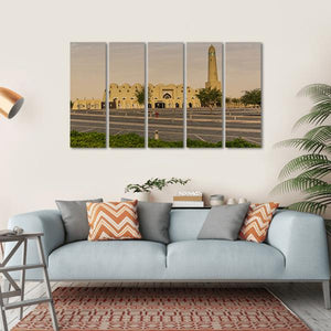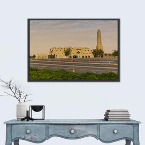 This canvas wall art captures the serene beauty of the National Mosque in Doha. Featuring a wide view of the mosque's architectural details, including arched windows and a patterned facade, it creates a peaceful atmosphere perfect for any space.