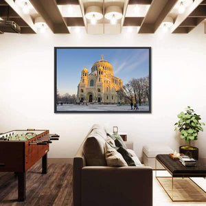 This canvas art features the grand Naval Cathedral in Russia, showcasing its golden dome amidst a serene winter scene. The realistic depiction captures the beauty of the architecture against a backdrop of soft snow, inviting a sense of tranquility.