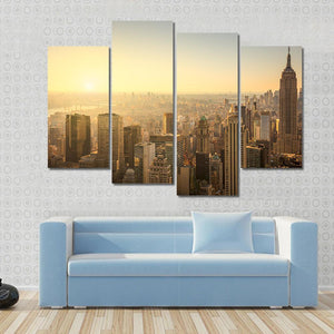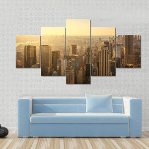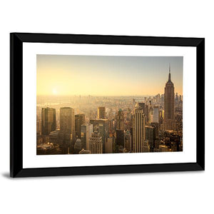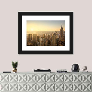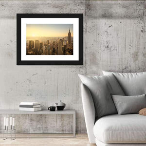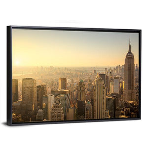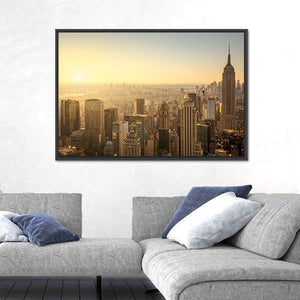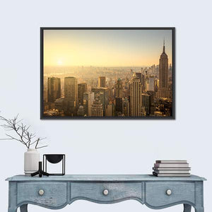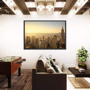 Capture the essence of New York City with this high-angle view of its iconic skyline, featuring the Empire State Building. The hazy atmosphere and warm palette of gold, orange, and brown evoke an urban mood, making it a striking addition to your wall decor.