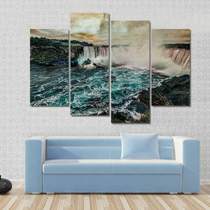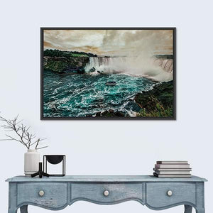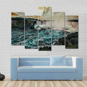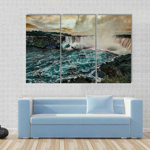 Capture the raw power of Niagara Falls with this striking canvas wall art. Featuring a dramatic waterfall, turbulent waters, and a boat navigating through the mist, it brings a serene yet overwhelming energy to your space.