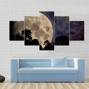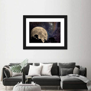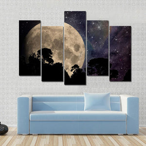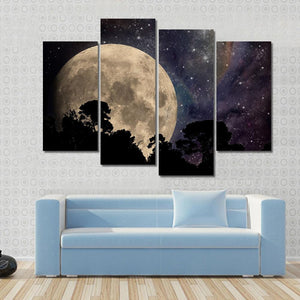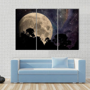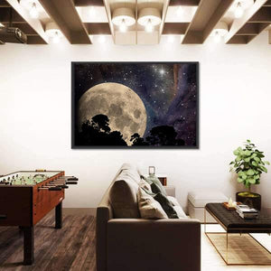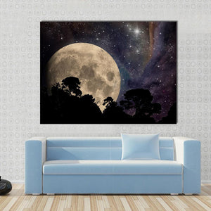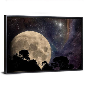 This captivating canvas art features a full moon shining over a serene night sky filled with stars, framed by silhouetted trees. Its mysterious and majestic vibe adds depth to any space.