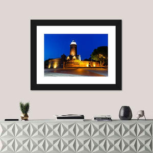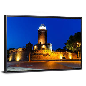 Lighthouse In Kolobrzeg presents a realistic, eye-level night view of an illuminated lighthouse beside brick fortress walls and a cobblestone plaza. The orange and blue palette gives a majestic, tranquil, historical mood that works well as wall decor in modern interiors and living spaces.