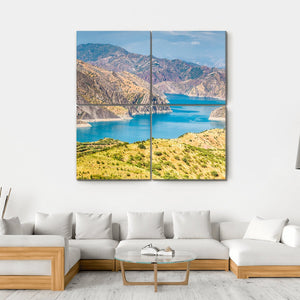 Experience the serene beauty of Nurek Reservoir in Tajikistan through this captivating canvas wall art. Featuring a wide shot of craggy mountains and a bright blue lake, this piece evokes a natural and vast atmosphere that invites tranquility into any space.