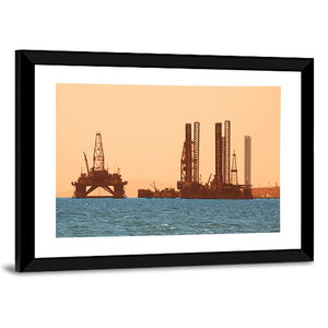 This canvas art features silhouetted offshore oil rigs against a vibrant sunset. With its industrial vibe, it's a striking piece that captures the vastness of the sea and sky, making it a compelling choice for modern decor.