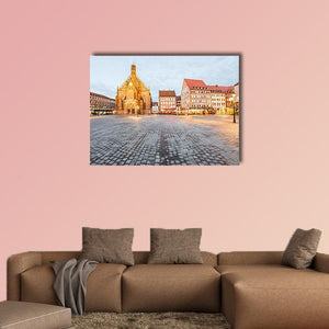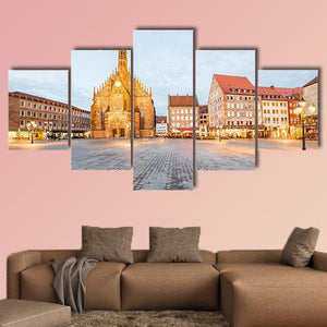 A realistic cityscape of an old cathedral, cobblestone square and surrounding buildings shown in a wide, symmetrical view. Muted browns, grays, warm oranges and cool blues create a historic, grand, and serene dusk atmosphere, with an ornate church tower, cobblestone pavement and lit windows as focal details. Suitable as home wall decor and for modern interiors.