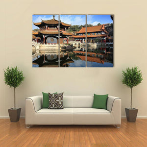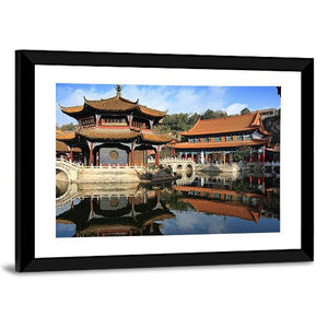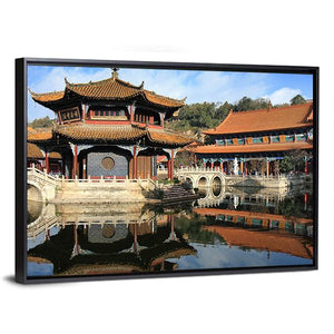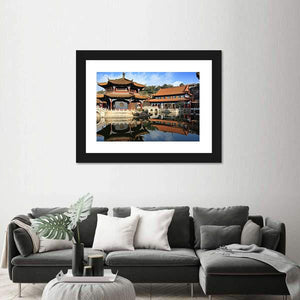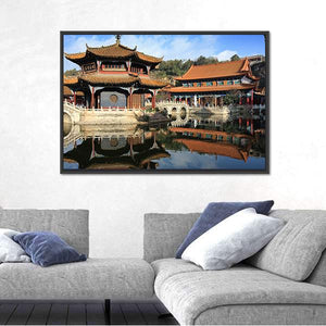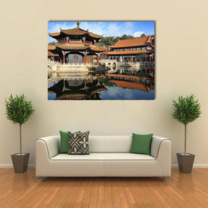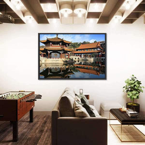 This canvas features a serene reflection of a traditional Chinese temple over a tranquil lake, showcasing beautiful shades of blue, orange, and brown. Its symmetrical composition and peaceful vibe make it an ideal piece for enhancing your home decor.