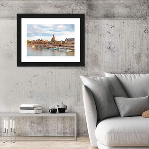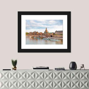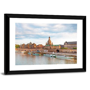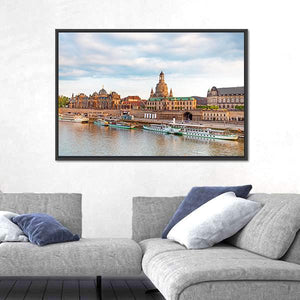 Capture the serene beauty of Old Dresden with this stunning canvas wall art. Featuring elegant domed buildings and boats calmly docked along the river, this piece evokes a picturesque urban atmosphere enhanced by a soothing palette of blue, brown, and green.