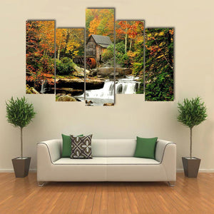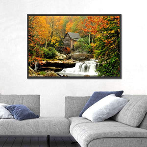 This canvas shows an old mill beside a multi-tiered waterfall set among colorful autumn foliage. The scene feels serene and nostalgic, with warm oranges, yellows and greens and a sense of motion in the water. It suits rustic or vintage décor and nature-inspired rooms.