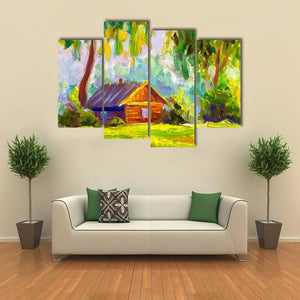 Old Wooden House Canvas Wall Art depicts a log cabin set among trees, foliage and a field, painted with thick brushstrokes and dappled light. Sunlit windows and a palette of greens, yellows, browns, blue and white create a peaceful, rustic, natural mood. It fits well in nature-inspired or rustic and modern rooms seeking a calm landscape focal point.