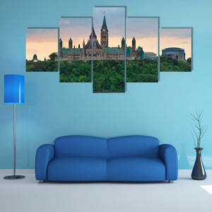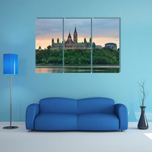 A realistic view of Ottawa’s skyline, showing the Parliament buildings and their clock tower beside the river and tree-lined banks. A calm, serene palette of greens, blues, greys and beige with a rule-of-thirds composition gives the scene a balanced, peaceful feel suitable for modern room decor.