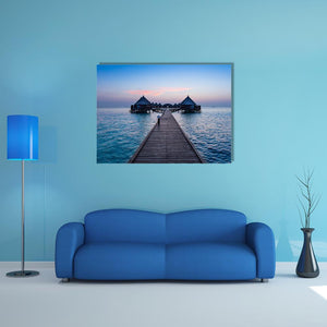 This canvas art features serene overwater bungalows set against a tranquil ocean sunset in the Maldives. The calming palette of blues, pinks, and browns creates a peaceful atmosphere, making it a perfect addition to your wall decor.
