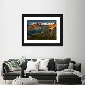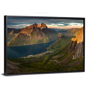 A serene, photorealistic panorama of Segla Summit at sunset. The print shows sunlit mountain peaks, calm water, and a small village tucked in the valley, with late-afternoon light and leading lines that carry a peaceful, majestic mood. Works well in modern living spaces or quiet studies.
