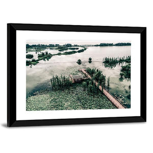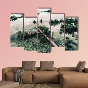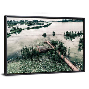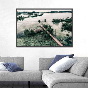 This landscape canvas shows a Canadian park with a lake, trees, a wooden boardwalk, a bridge and a small hut, presented in a green, blue, brown and gray palette. The scene reads calm and natural, with an aerial perspective and leading lines that guide the eye. It suits modern or nature-inspired rooms as a tasteful wall decor piece.