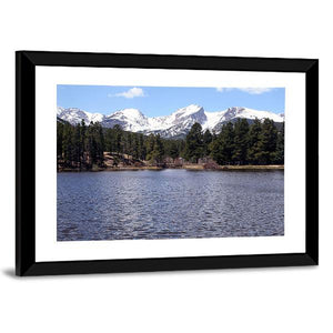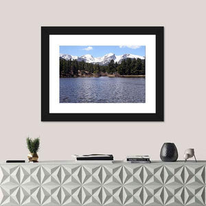 This landscape canvas features snow-capped Colorado mountains, pine trees, and a calm lake rendered in blue, green, white, and brown tones that feel serene and majestic. The composition emphasizes depth and a natural, rustic mood, making it a quiet focal point for nature-inspired home decor and both rustic and modern spaces.