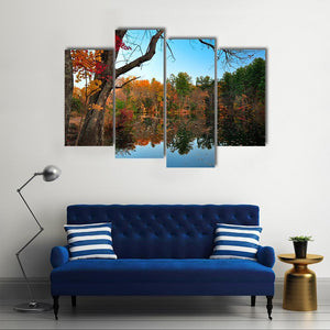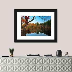 This canvas wall art captures the serene beauty of autumn foliage with vibrant reds, oranges, and greens. Featuring a tranquil lake framed by trees and reflections, it brings a peaceful ambiance to any space.